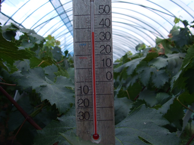 午後3時、ハウス内の温度計は37度をさしています。