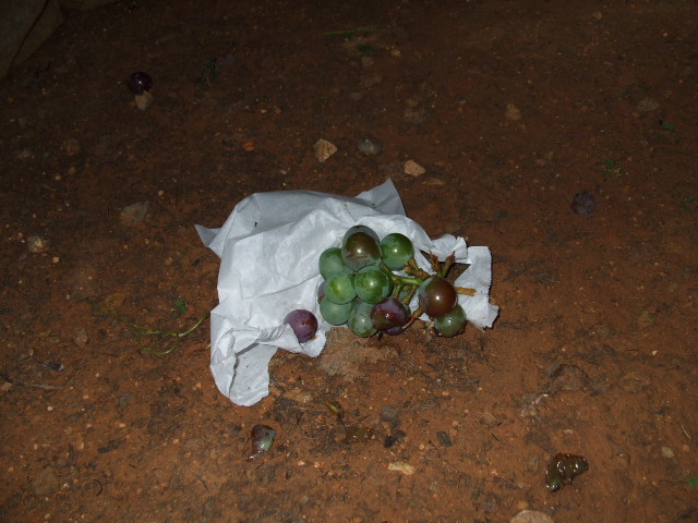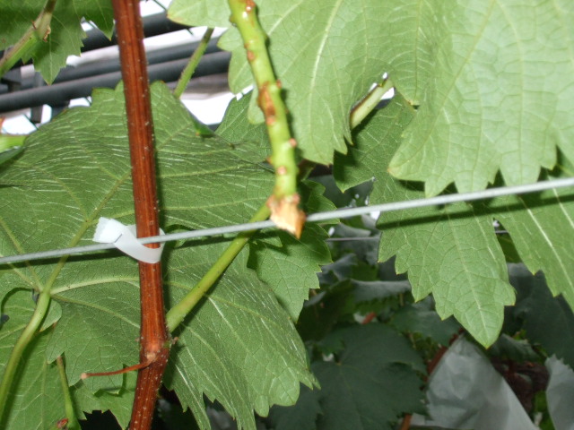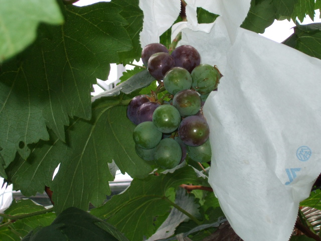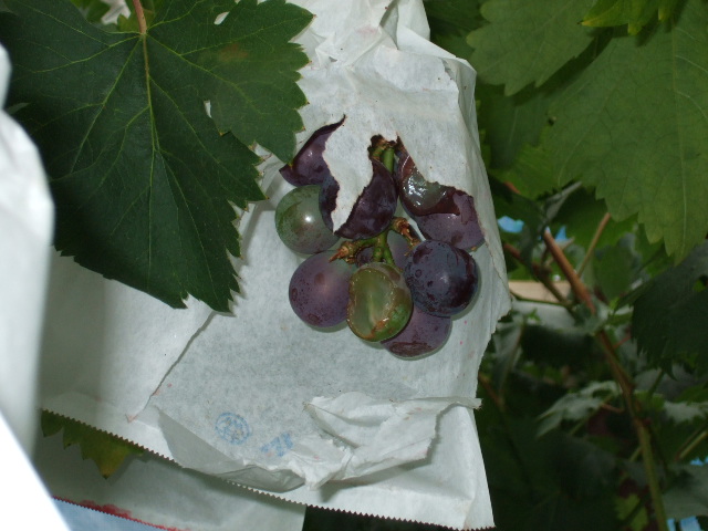 あれっ?あるべきところにブドウがありません。 果軸を食いちぎって、房ごと持ち逃げした模様です…。 末恐ろしいです。 もう、ふざける余裕もなくなってきました…。 もっと、たのしい出来事をブログに綴りたいです…。 |